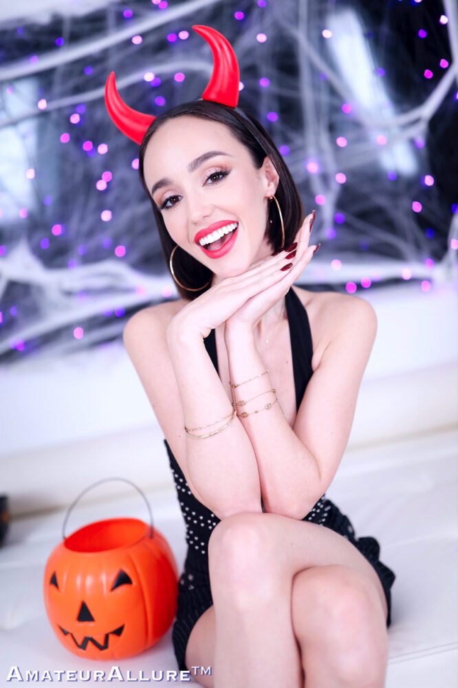 Amateur Allure welcomes Christina Sage, a sexy, slender, 28 yr old from Miami, Florida standing 5′-6″ tall. Christina has beautiful long legs and a mouth designed for giving head. She saw our sight and was eager to visit. Christina is happily surprised when she unwraps Codey’s cock. She twists and pulls his shaft, teasing the head with her luscious lips and tongue. Christina doesn’t forget his balls either. After having her oral fix she strips off her clothes to put on her sexy lingerie. Next Codey penetrates her wet pussy, fucking her good and hard in different positions bringing Christina to multiple orgasms. Then she hops down sucking her juices off his dick until Codey fires a hot load of sticky cum on her tongue and down her throat! HAPPY SWALLOWEEN! Enjoy, Thomas